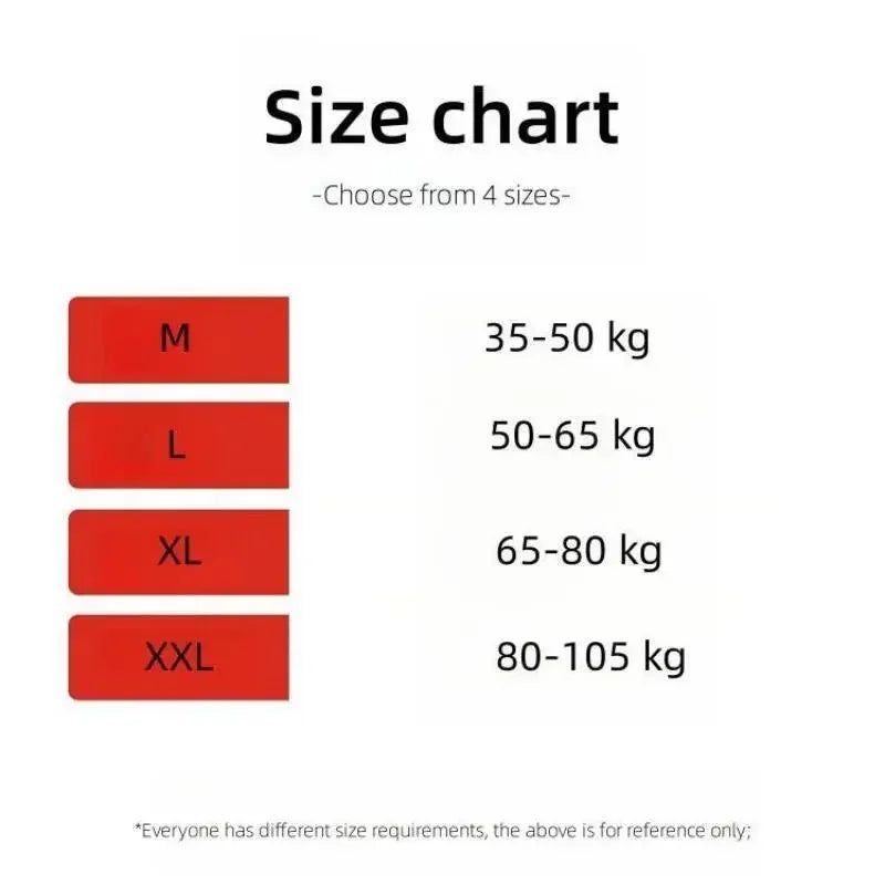 - Varied sizes: M (35-50 kg), L (50-65 kg), XL (65-80 kg), XXL (80-105 kg) ensure a secure, comfortable fit for different leg shapes.