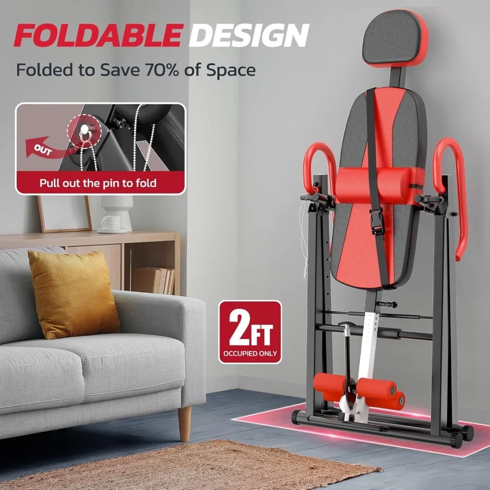 - Adjustable Inversion For All Users: 6-angle rear cross bar enables precise angle adjustments (no traditional strap system). The safety belt is adjustable, accommodating users 4'10" to 6'6" tall.