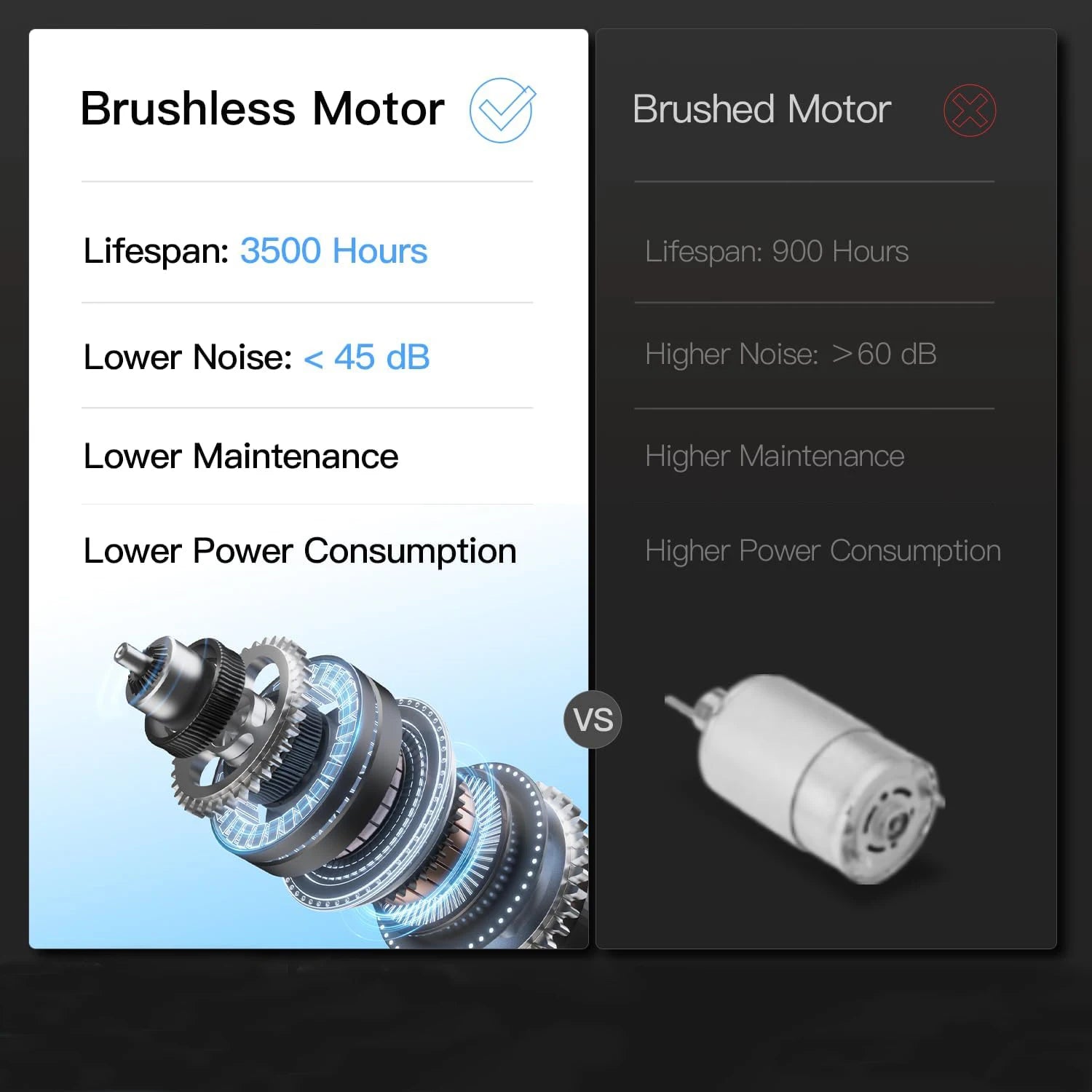 - Quiet, reliable motor: brushless 2.5 HP for smooth acceleration and low maintenance, with noise levels as low as 40-65 dB.
