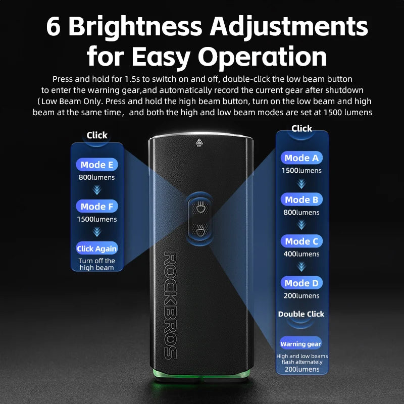 - Six modes with memory: switch between low beams (1500/800/400/200 lm) and high beams (1500/800 lm) to match your ride and maximize runtime.